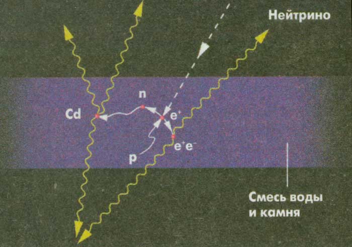 ИНДИКАЦИЯ НЕЙТРИНО. Нейтрино очень слабо взаимодействует с материей. Они беспрепятственно проходят сквозь объекты земного диаметра, не будучи ими поглощены. Поэтому их очень трудно изучать. В этих целях используют ловушки огромных размеров, которые рассчитаны на то, что увеличится вероятность взаимодействия какого-нибудь нейтрино с веществом ловушки. Чтобы избежать неожиданного возникновения посторонних сигналов в результате прохода частиц других типов, что сделало бы невозможным анализ данных, ловушки для нейтрино устанавливают высоко в горах или на океанском дне. Таким образом, космические лучи, которые легко взаимодействуют с материей, большей частью поглощаются горами или водой, а нейтрино удается эти препятствия преодолеть. Ловушки, похожие на большие чаны, наполнены веществом, атомы которого могут взаимодействовать со сталкивающимися с ними на своем пути нейтрино. Но, несмотря на это, нейтри-но в этих огромных аппаратах выявляется в количестве всего нескольких частиц за сутки.