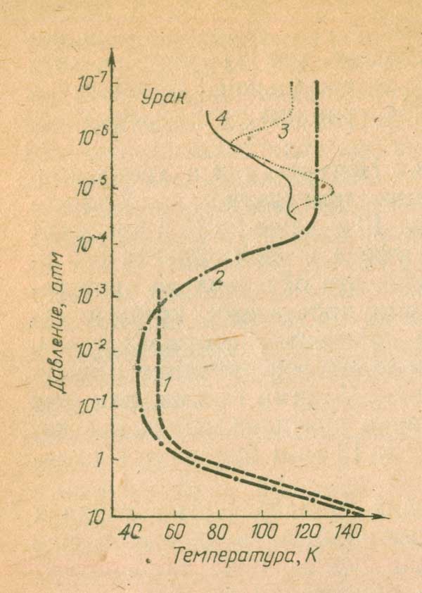 В верхней атмосфере как Нептуна, так и Урана имеют место локальные вариации температуры - отклонения от среднего значения на 10 и даже 20 К в пределах отдельных слоев, т. е. атмосфера в этой области неизотермична (рис. 6). Возможно, это обусловлено протекающими там фотохимическими процессами, которые сопровождаются изменением количеств некоторых газов, участвующих в поглощении солнечной радиации и излучении энергии нагретых слоев. Такими газами, как уже отмечалось, могут быть этан и ацетилен, излучение которых вблизи длин волн 12 и 13 мкм приводит к охлаждению атмосферы.