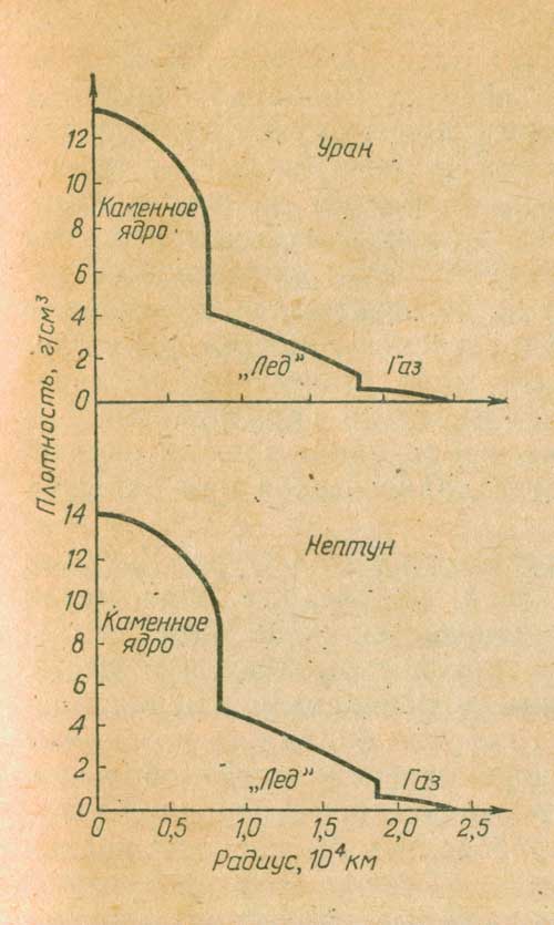 Надо сказать, что трехслойная структура Урана и Нептуна вовсе не обязательна: "льды", т. е. вода, метан и аммиак, могут быть перемешаны с веществом "скального" ядра, могут быть и другие комбинации веществ. Правда, имеющиеся данные о периодах вращения планет (заведомо не короче 10 ч) как будто уже позволяют отбросить модели, не содержащие "ледяной" оболочки, так же как и модели с не меняющейся с глубиной плотностью, для которых потребовались бы периоды вращения более 24 ч.