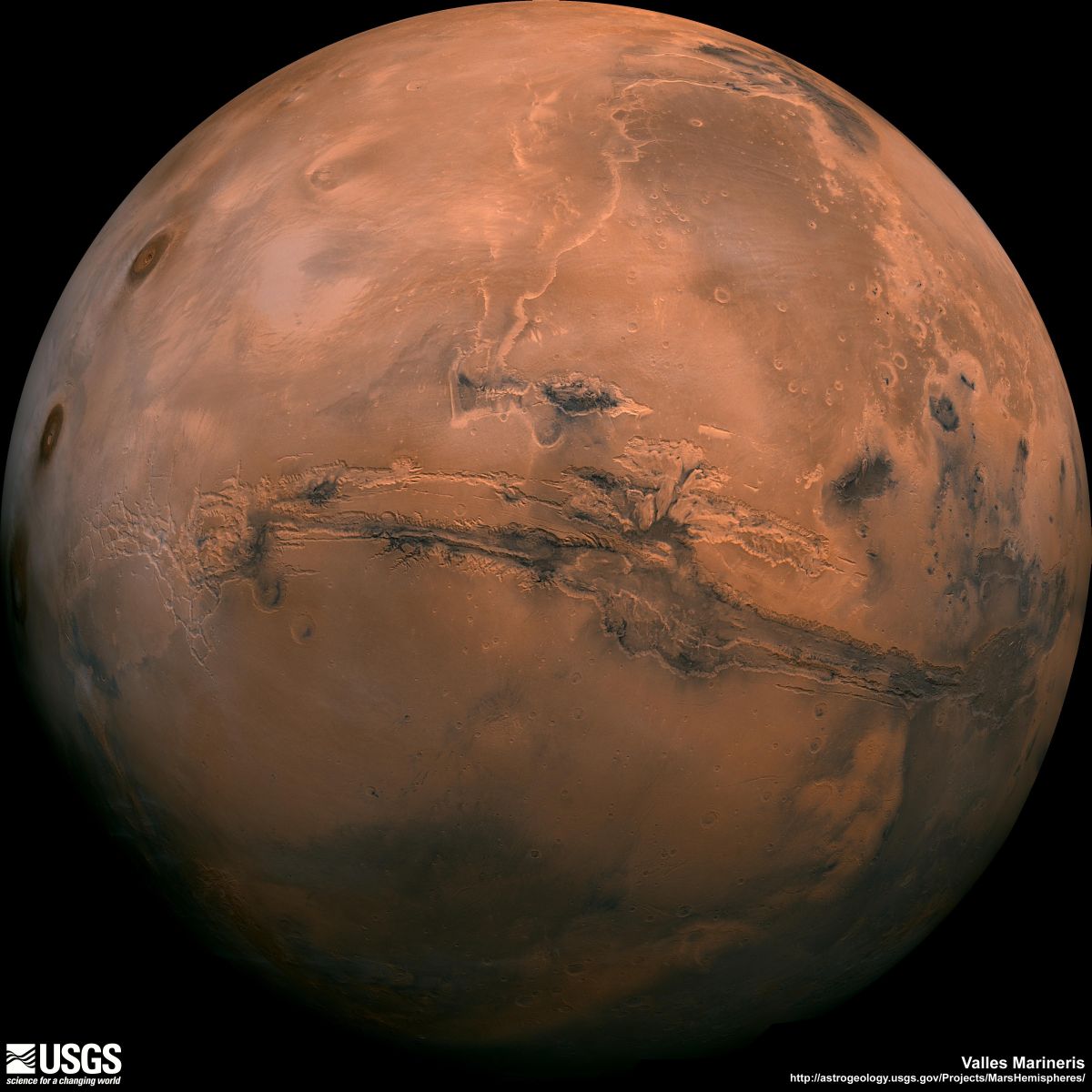 В центре - гигантский каньон Долины Маринера, протянувшийся приблизительно вдоль экватора."