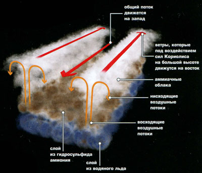 Верхние слои атмосферы движутся на запад, в направлении вращения самой планеты. В то же время силы Кориолиса толкают аммиачные облака в противоположную сторону.