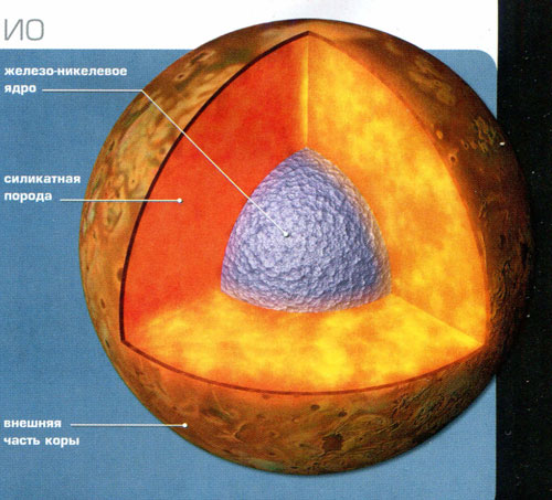 На поверхности Ио находится огромное количество серы, однако в ее недрах преобладают силикатные породы - этим спутник напоминает объекты внутренней части Солнечной системы. По одной их гипотез, тепло, выделившееся при образовании Юпитера, превратило часть льда, находившегося в облаке материала, из которого зародились спутники. Ио появилась в той части облака, где были только обломки твердого, каменистого материала. Предполагают, что у Ио есть твердое ядро с большим содержанием железа, а вокруг него располагается полурасплавленная мантия из силикатных пород. Внешняя часть коры глубиной 20-30 км представляет собой смесь базальтовых пород, напоминающих земные вулканические породы.