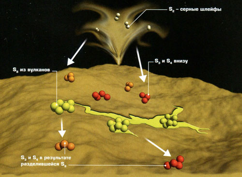 Второй фактор - присутствие огромного количества серы в коре Ио. Ученые измерили температуру лавовых потоков и теперь знают, что во многих извержениях на Ио задействуются расплавленные силикатные породы, напоминающие земные. Избыток серы на Ио также объясняет разноцветные узоры на поверхности этого спутника.