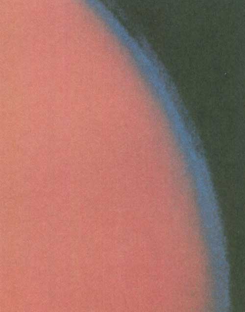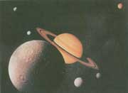 Снимок Сатурна с приближающегося "Вояджера". По сравнению с кольцами других газовых планет-гигантов система колец Сатурна чрезвычайно развита. Кольца очень яркие и окрашены в разные цвета. Общая ширина колец - 400 тыс. км, а толщина в некоторых местах не превышает нескольких десятков метров. Полагают, что возраст колец составляет всего лишь 100 миллионов лет. В результате набора пыли и динамического взаимодействия со спутниками происходит потемнение колец и постепенное "проседание" их в сторону планеты-гиганта. В течение следующих нескольких сотен миллионов лет они могут потерять свой блеск. Со времен Галилея астрономы пытались понять тайну этих колец. Сатурн находился 31 декабря 2003 года в ближайшей к Земле точке -на расстоянии 1 миллиард 200 миллионов километров и был в центре внимания всех астрономов. В ближайшие месяцы будут продолжаться интенсивные наблюдения планеты с помощью наземных телескопов