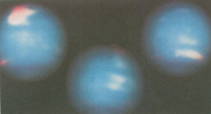 Надо сказать, что любые данные с борта "Вояджера" в течение всех 12 лет его странствий по пространству Солнечной системы были сенсационными: впервые люди на Земле могли увидеть знакомые им по популярным книжкам небесные тела вблизи! Нам очень повезло, что мы оказались современниками этих блистательных достижений интеллектуальной мысли и технической реализации идей земной цивилизации! Представьте себе, за время полета аппарата в околосолнечном пространстве он прислал 115 тысяч уникальных снимков встреченных по дороге планет и их спутников, из которых 9 тысяч были получены им при подлете к Нептуну! Конечно, сверхудивительного зрелища ожидать не приходилось: многое ли вы увидели бы на фотоснимке, сделанном ночью в деревне, где нет электричества. И тем не менее, снимки планеты и ее спутников сами по себе уже были сенсацией: космический зонд после стольких лет сверхскоростного полета сохранил свою работоспособность и безукоризненную связь с Землей. Это был триумф земной науки!