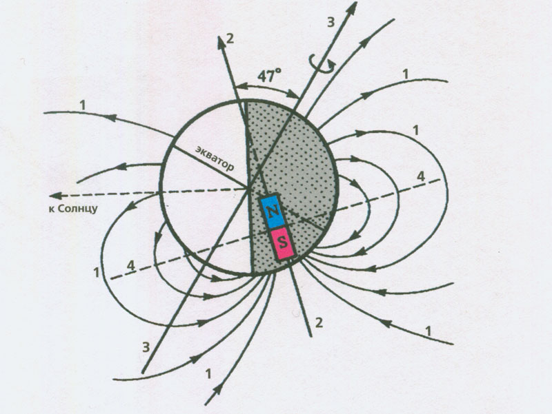 В случае Нептуна, как и у Урана, ротатор оказался наклоненным относительно плоскости экватора планеты. Угол между осью вращения планеты и осью магнитного диполя составляет почти 47° (у Урана 50°). Так что за планетой, то есть в направлении от Солнца, силовые линии поля оказываются тоже перекрученными двойным жгутом, но напряженность поля почти вдвое ниже.