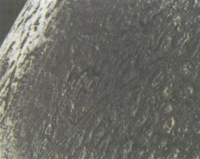 Рассмотрим лучший снимок, переданный наземным лабораториям. Восточную область диска (правая сторона) занимает темная широкая достаточно плоская равнина, по форме напоминающая мексиканскую дыню канталупу. Ее и назвали Долина Канталупа. Поражает практически полное отсутствие древних ударных кратеров, что является свидетельством ее сравнительной молодости. Похоже, что ударные кратеры многократно заполнялись ледяными лавами при местных извержениях. В процессе тектонических явлений ледяная кора трескалась, а из разломов выливались грязные ледяные потоки, которые также замерзали. Только в одном из плоских морей виден допотопный, в полном смысле слова, кратер от старой метеоритной бомбардировки, имеющий примерно 13 км в диаметре.